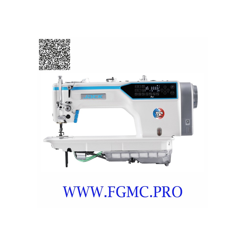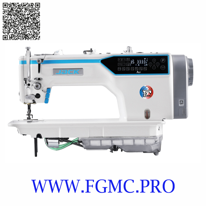 Machine à coudre numérique à point noué Jack A6FE-Q, avec griffes d'entraînement et pointe d'aiguille. Équipée d'un coupe-fil, d'un système d'arrêt numérique, d'un relevage automatique du pied-de-biche, d'un réglage numérique de la longueur et des motifs de point. Tête de couture sèche, condenseur de point de fin de point, coupe courte à double lame de 3 mm, bras allongé, bac à huile étanche et moteur intégré.