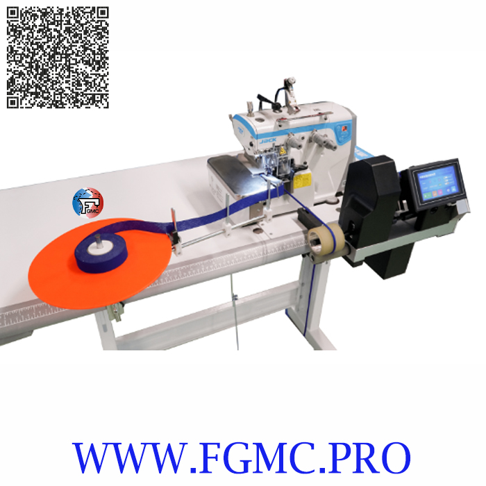 Surjeteuse avec dispositif de couture spaghetti : le ruban de 25 mm entre dans le guide, est cousu, puis tiré par le tireur électronique. Des capteurs de rupture de fil et de fin de ruban arrêtent automatiquement la couture en cas de rupture de ruban.